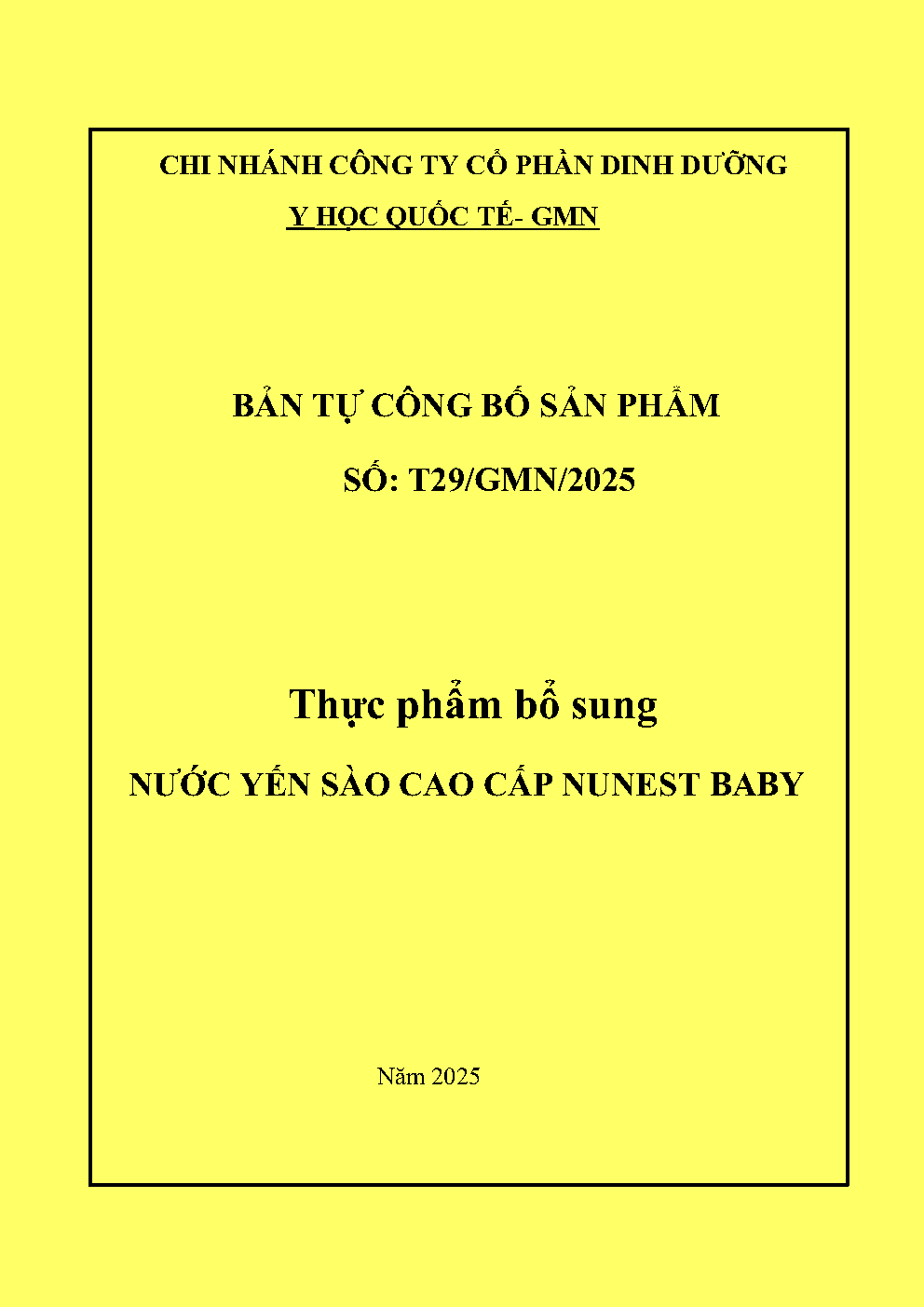 Tự công bố Thực phẩm bổ sung Nước Yến sào cao cấp Nunest Baby – Số: T29/GMN/2025