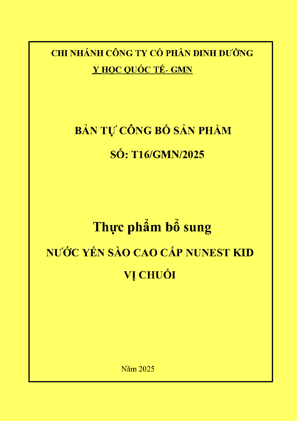 Tự công bố Thực phẩm bổ sung Nước Yến sào cao cấp Nunest Kid vị Chuối – Số: T16/GMN/2025